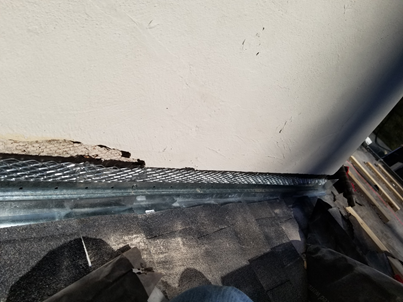 Roof terminations are similar to grade terminations in how they are made or installed yet provide a much different function. Stucco is not supposed to touch the roofline. Every manufacturer has this specification. By raising the cladding two inches up it provides the following: 1) A clear path of flow for water along the flashing 2) A visible inspection of the flashing condition 3) Prevents damage when you have your roof replaced. Peachtree Stucco performs roof terminations also!